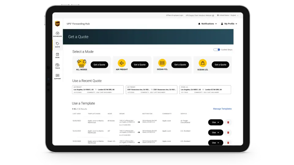 Es un mercado dinámico, y sabemos que tener la última tarifa es fundamental para su negocio. Consulte el UPS Forwarding Hub para comparar cotizaciones aéreas y marítimas, reservar y rastrear sus envíos, y recibir alertas proactivas que lo ayuden a mantener a los clientes informados.