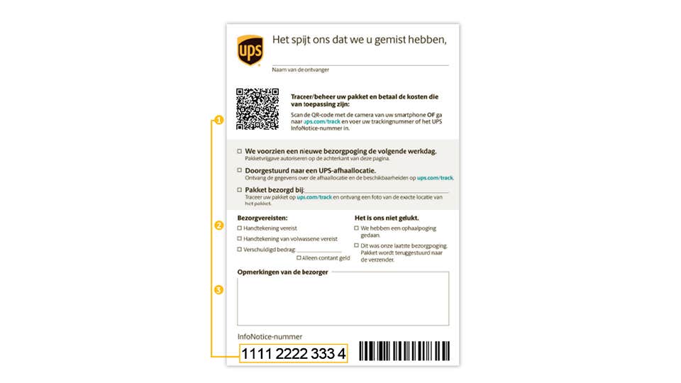 Sorry, we hebben u gemist. Uw chauffeur heeft een UPS InfoNotice achtergelaten omdat diens eerste poging om uw pakket af te leveren of op te halen niet succesvol was.