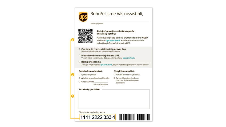 Je nám líto, že jsme Vás nezastihli. Řidič zanechal avízo UPS InfoNotice, protože první pokus o doručení nebo vyzvednutí zásilky nebyl úspěšný.