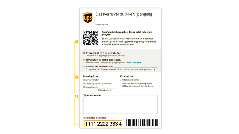 Beklager at vi ikke traff deg. Sjåføren la igjen en UPS InfoNotice fordi første forsøk på å levere eller hente pakken mislyktes.